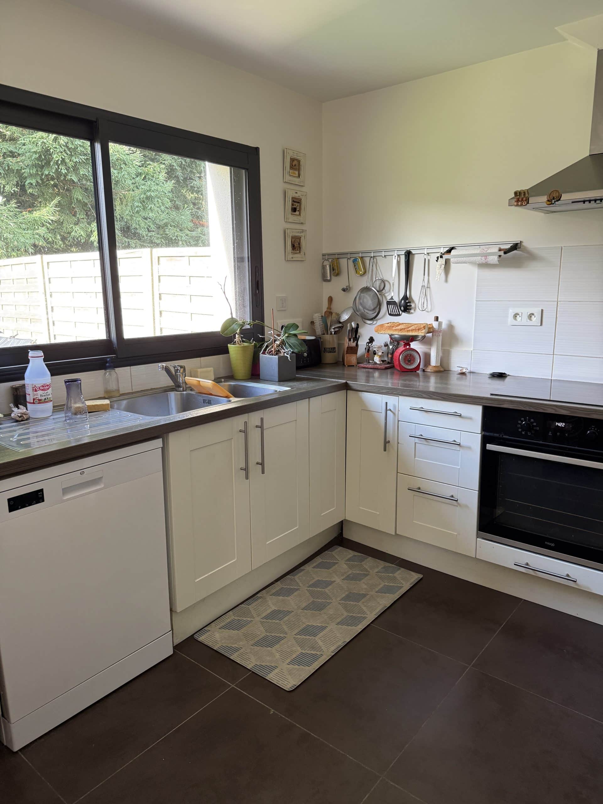 Une maison contemporaine baignée de lumière construite en 2012 comprenant une entrée avec placards, un salon séjour prolongé par une cuisine aménagée et équipée, wc